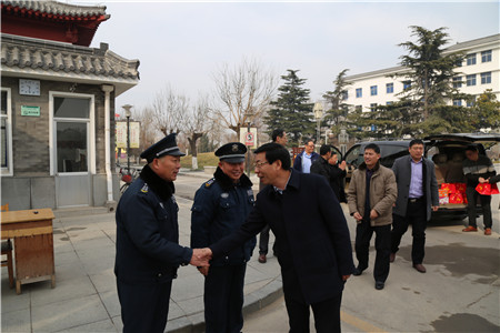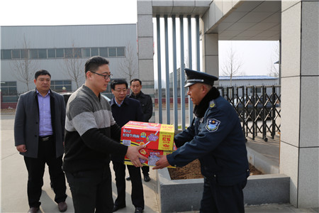 1月26日,春節來臨之際,受董事長、總裁荀金慶委托,集團常務副總裁楊中河、黨總支副書記李曉虎、副總裁姚彥偉、工會主席孫凡華、總裁助理孔令東、仙文等集團領導一行分別到報警公司、曲阜分公司、犬業公司、濟寧分公司慰問春節期間工作在一線的保安員工。